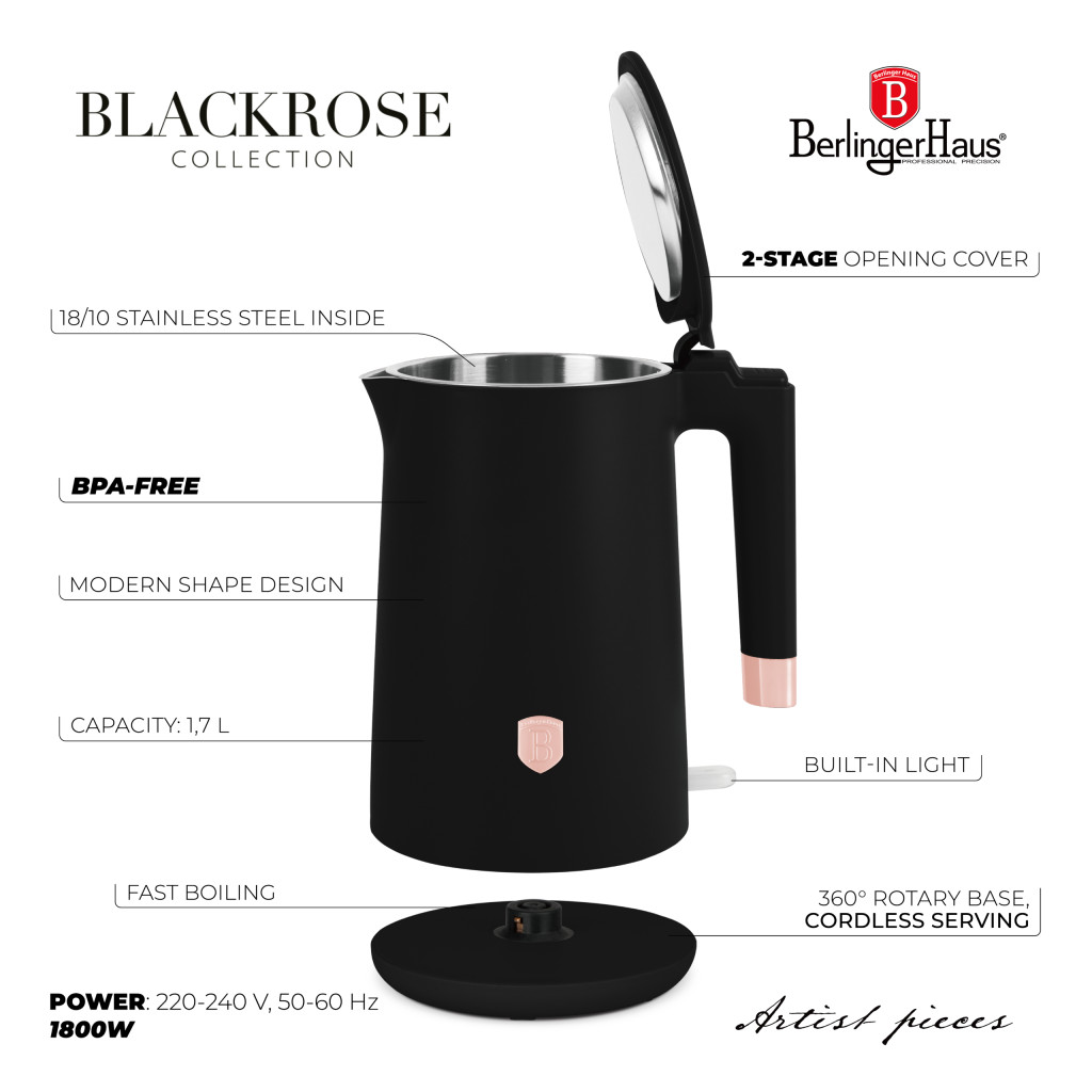 A Dupla falú elektromos vízforraló (1800 W) a Black Rose Collection része, amely eleganciát és funkcionalitást hoz a konyhájába. Ez a kollekció nemcsak a teljesítményével, hanem a stílusával is lenyűgöz, így a konyhai eszközök nemcsak hasznosak, hanem dekoratív elemek is lehetnek a konyhapulton.