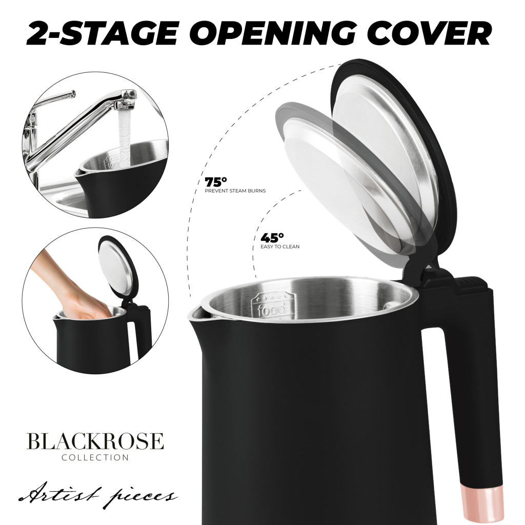 A fekete és rose gold színkombináció modern és elegáns megjelenést kölcsönöz a vízforralónak, amely bármilyen konyhai dekorációval harmonizál.