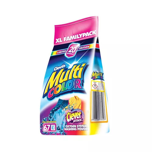 Clovin MultiColor univerzális mosópor fehér és színes ruhákhoz.Alkalmas minden típusú mosógéphez és kézi mosáshoz.Gyapjú és selyem mosására nem alkalmas!- Megőrzi a ruhák színét- Higiénikusan tiszta és ápolt ruhák- Ragyogó tisztaság és frissesség- Tartalmaz olyan anyagokat, melyek védik a mosógépet a vízkő- lerakódástól.