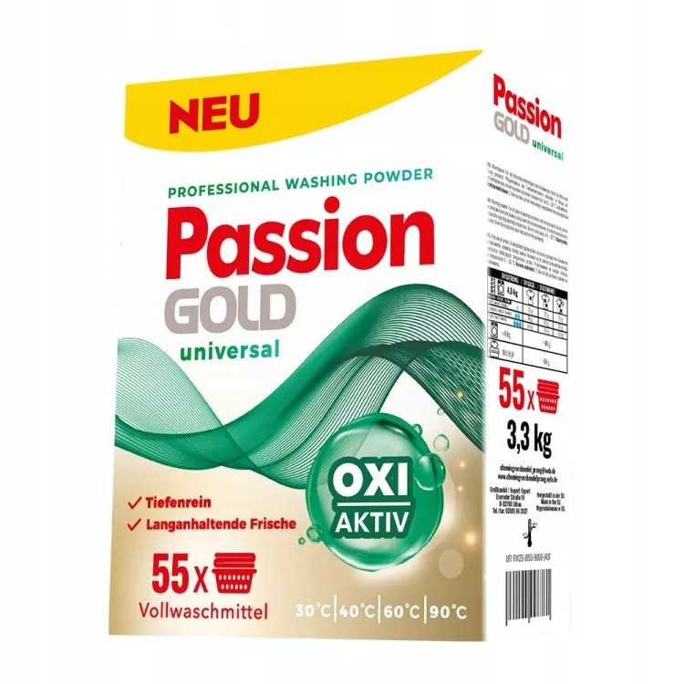 PASSION GOLD mosópor univerzális 3,3kg-os kiszerelésben. Akár 55 mosásra is elegendő.