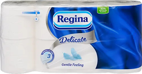 Tapasztalja meg a kényeztető puhaságot minden használat során a Regina Delicate Gentle Feeling toalettpapírral! Ez a prémium minőségű, 3 rétegű papír különösen puha, mégis erős és megbízható, így ideális választás az egész család számára.