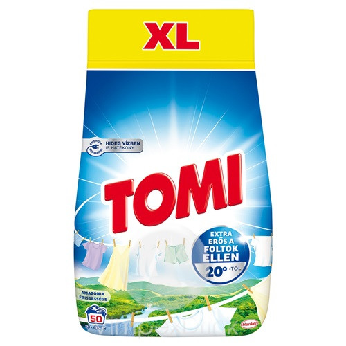 Erőteljes új formulájának köszönhetően a Tomi a legmakacsabb foltokat is eltávolítja. Hatékony minden mosási fokozaton, akár 20°C fokon is, energiát megtakarítva. Emellett nagy mennyiségű szennyezett ruhát varázsol ragyogóan tisztává, miközben friss illatot is kölcsönöz nekik. Ki sokat mos, Tomival mos!